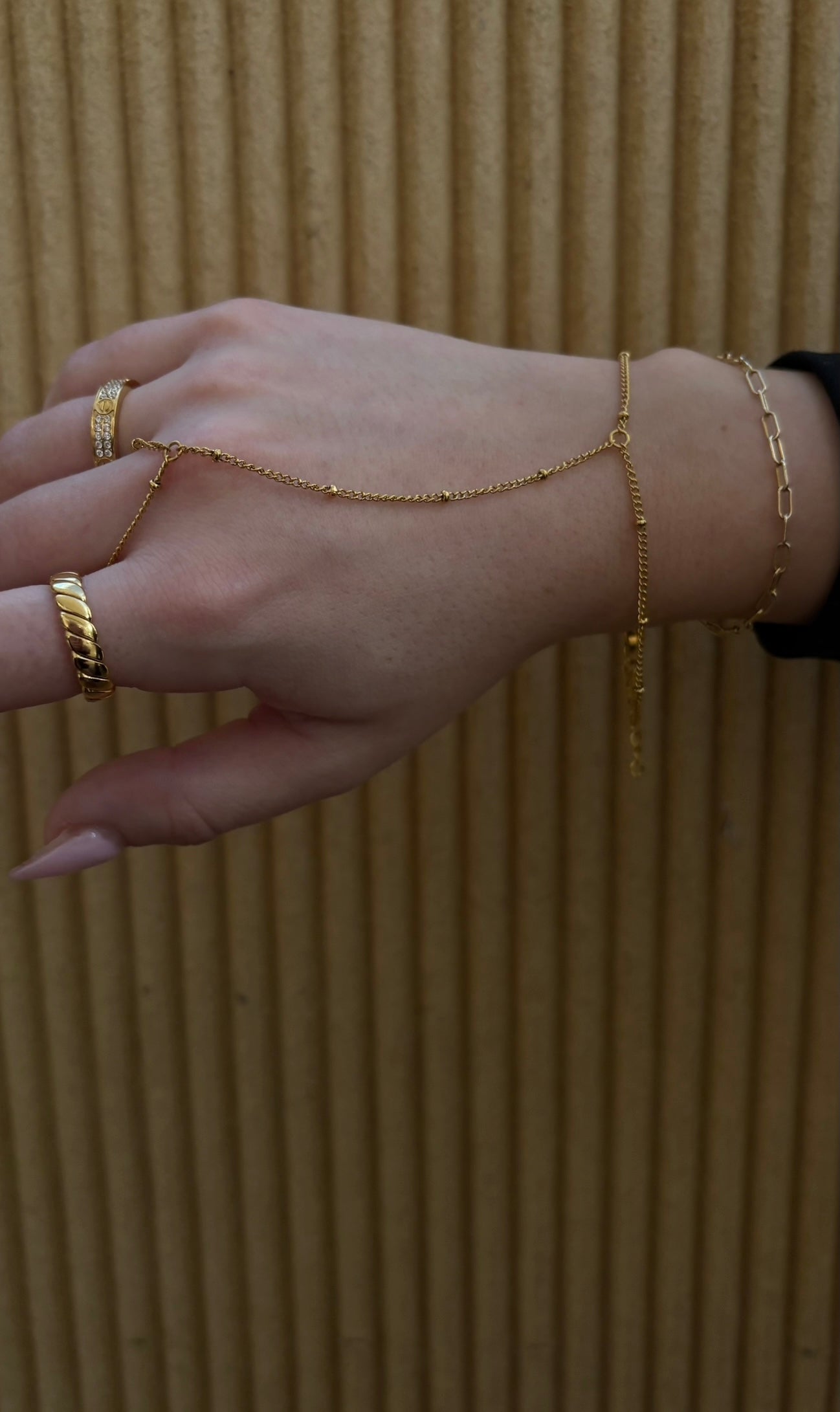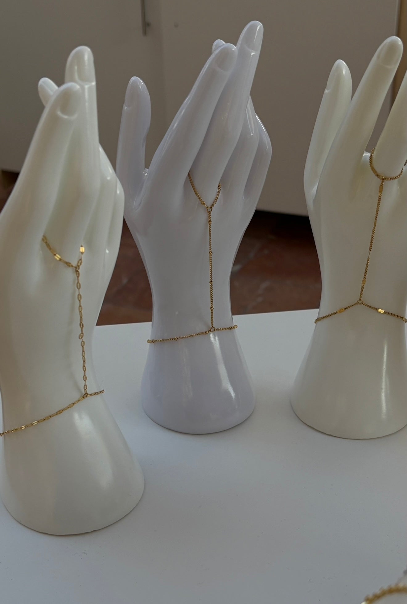 Elevate your everyday look with our new collection of hand chains—designed for effortless style and endless stacking. Crafted from durable stainless steel and finished in a radiant 18K gold plating, these pieces are made to shine without fading. Choose from three unique styles that add just the right touch of bold or delicate detail to your wrist game.