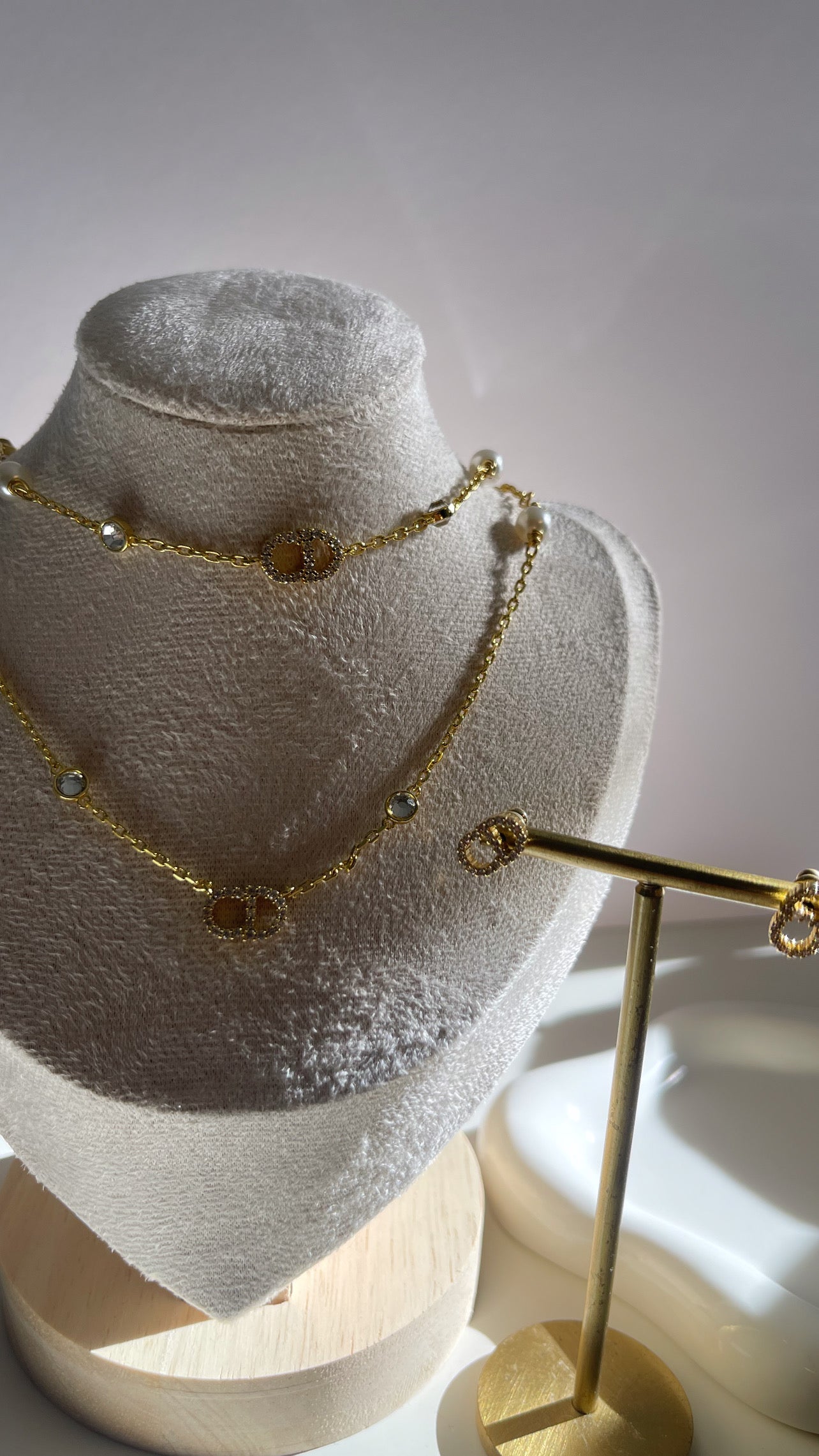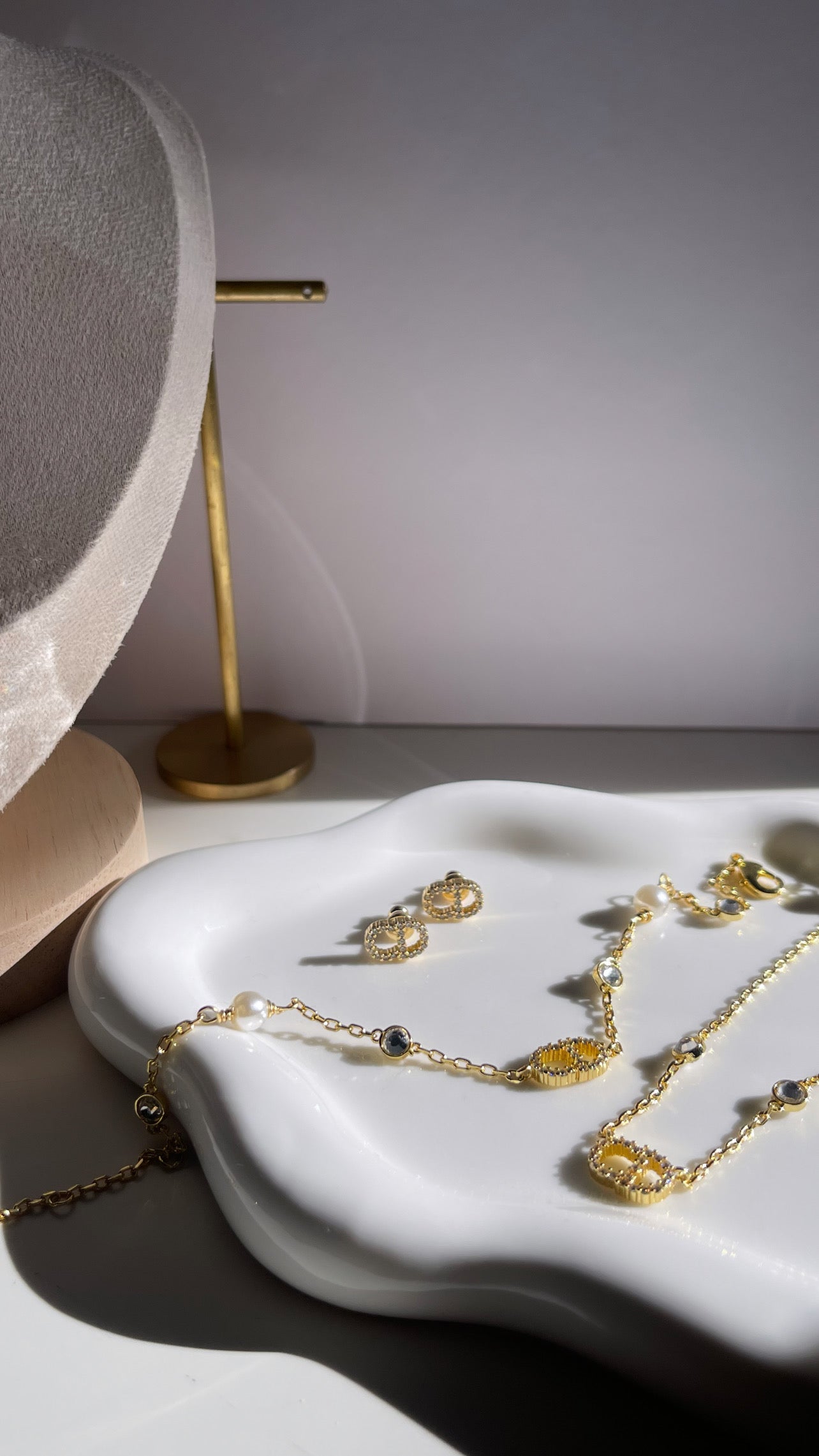 This stunning Dior set is inspired by the Clair D Lune bracelet, necklace and earring. Each item has white crystals and white resin beads creating an elegant and classy accessory to wear everyday.