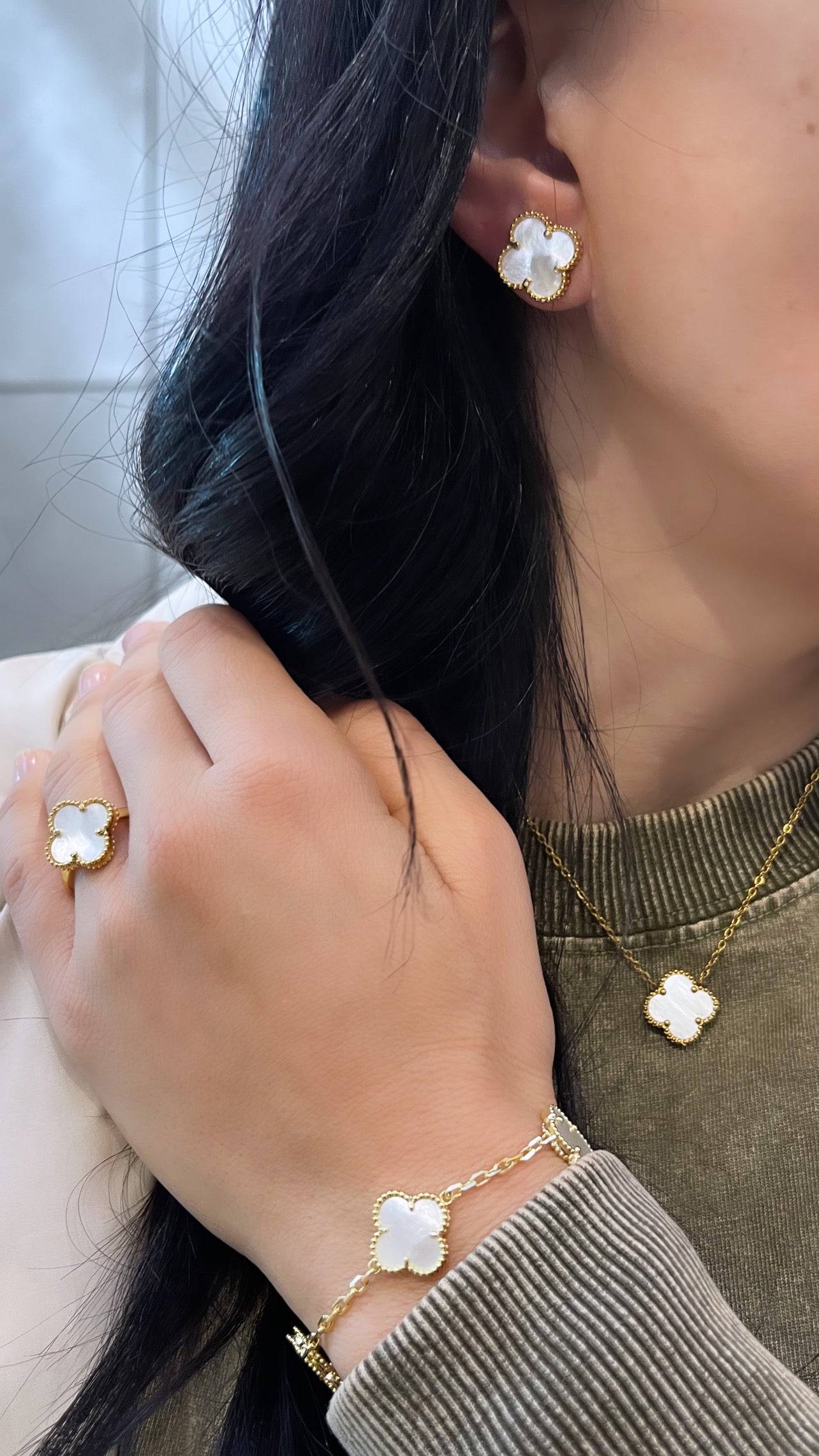 Stunning clover set includes matching bracelet, necklace, earrings and ring. Available in white, black, gold and green