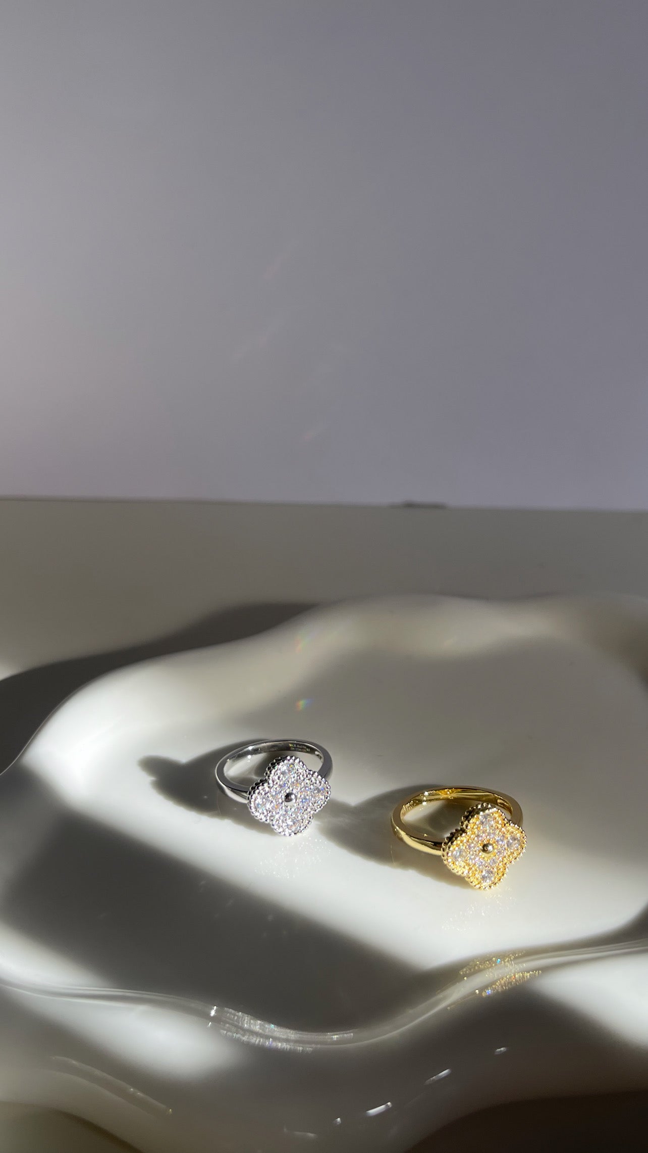 Stunning clove ring with over 25 crystals matches perfectly with the bracelet and necklace. This ring is available in gold and silver from size 5-9.