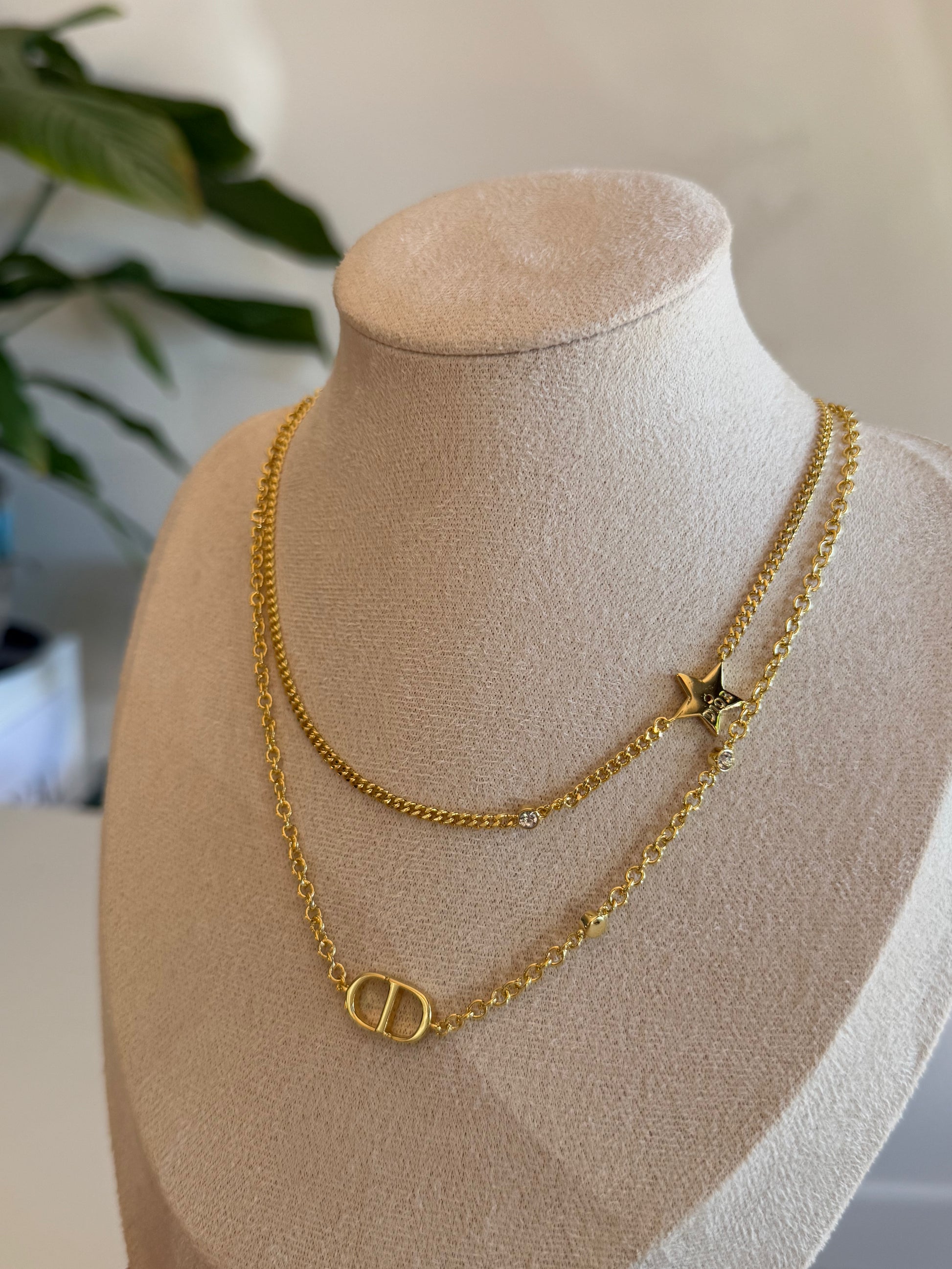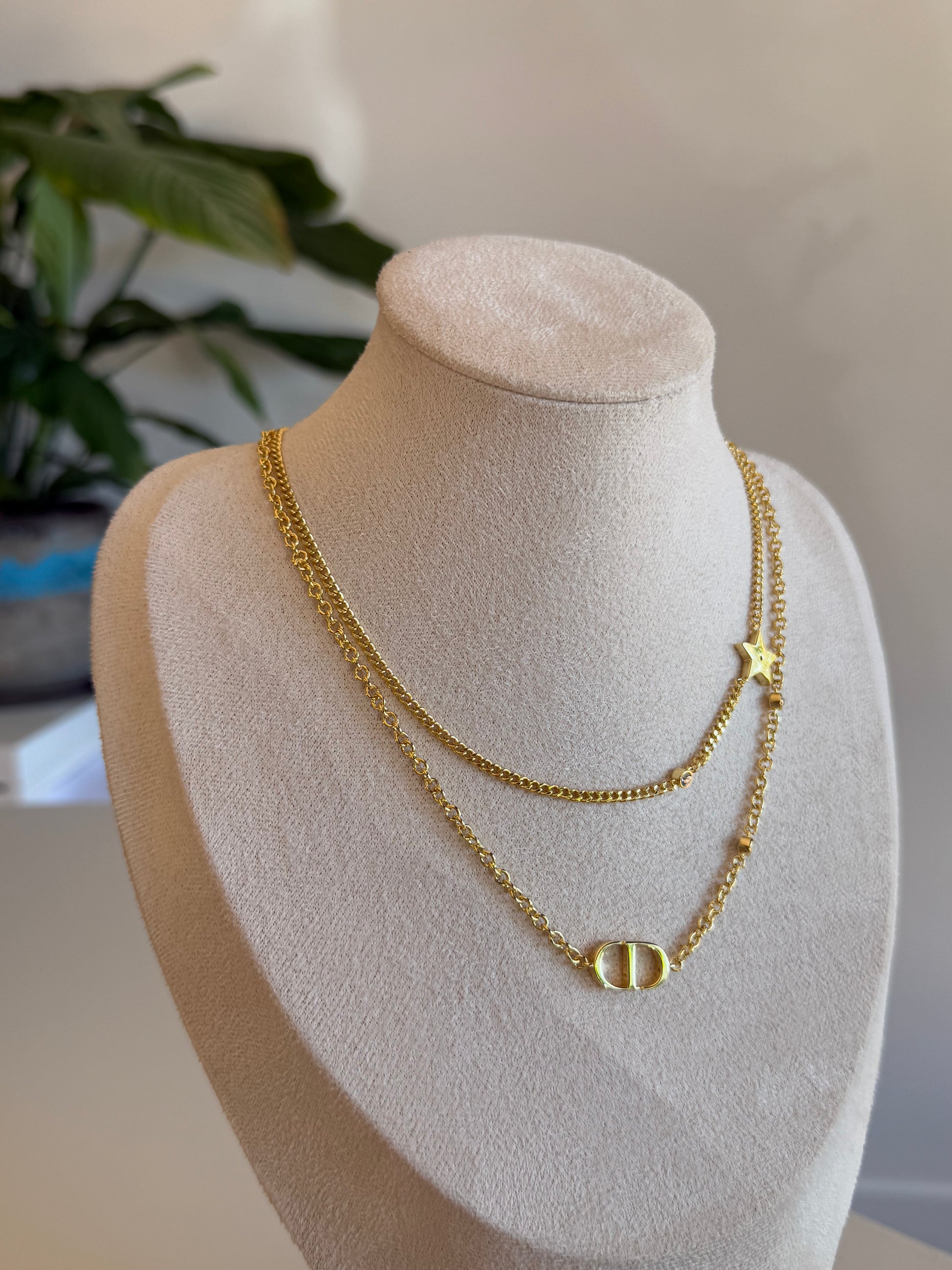 This eye-catching necklace features a double-chain design, with one chain slightly longer than the other, making it the ultimate layered accessory.