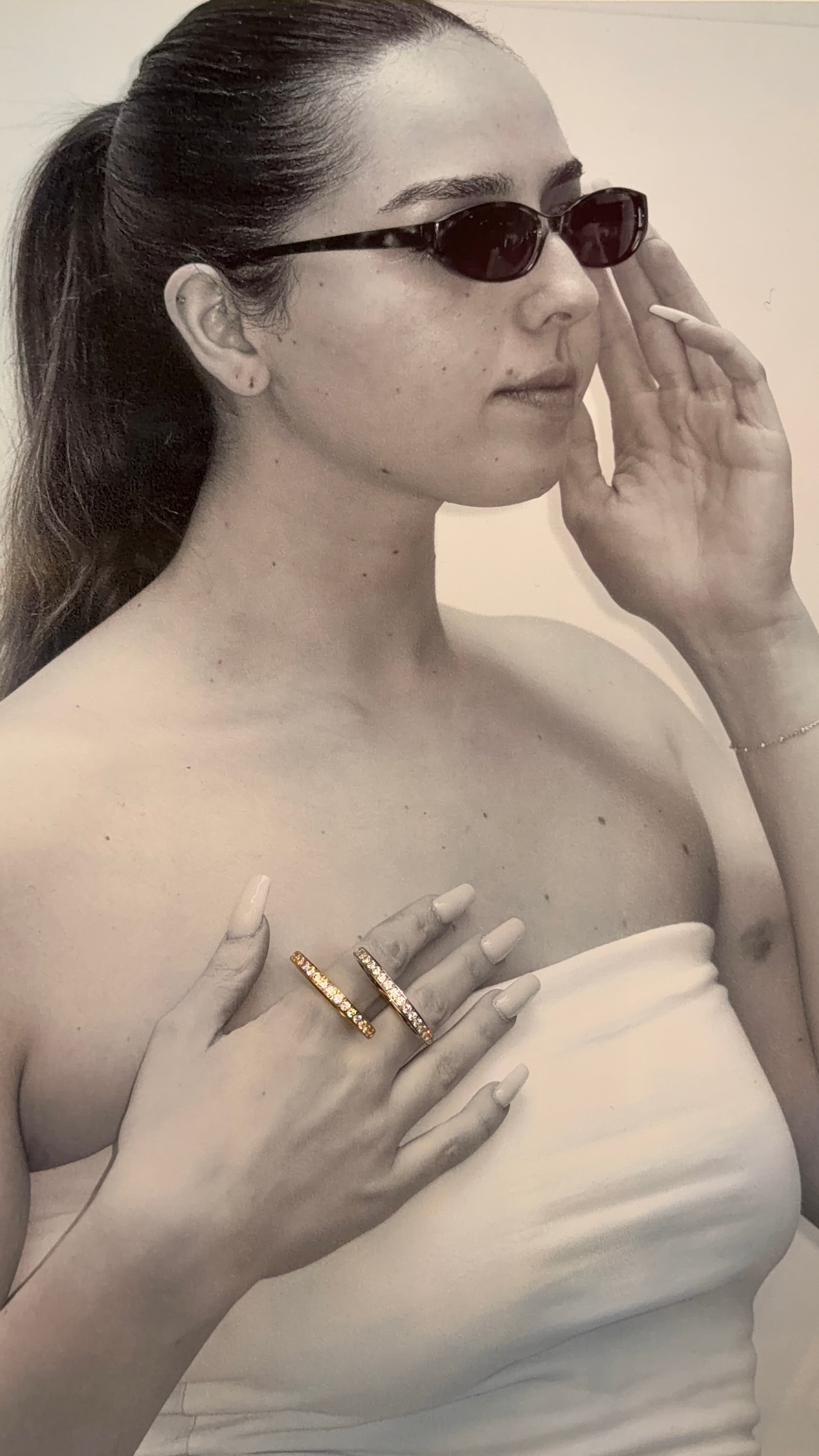 A timeless, sparkly essential for your everyday stack. This elegant band features rhinestones set all the way around, catching the light from every angle. Crafted from stainless steel and finished with premium 18k gold plating for durability, shine, and everyday comfort.