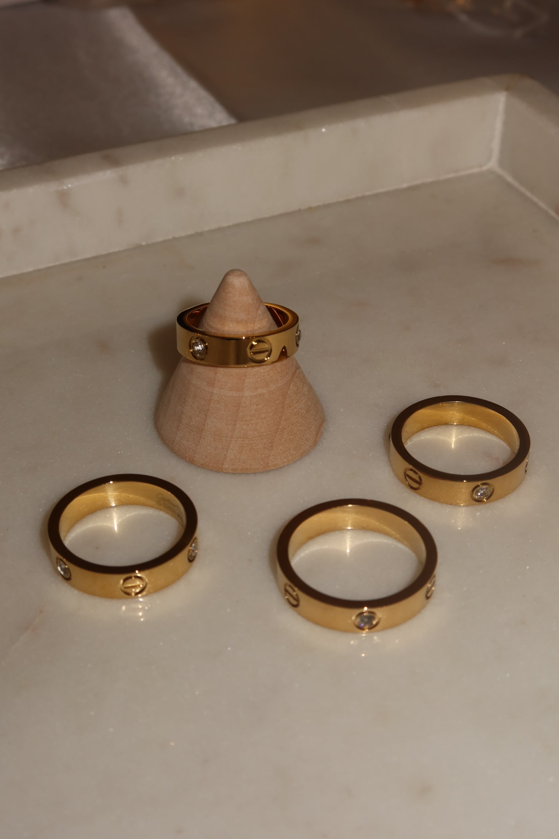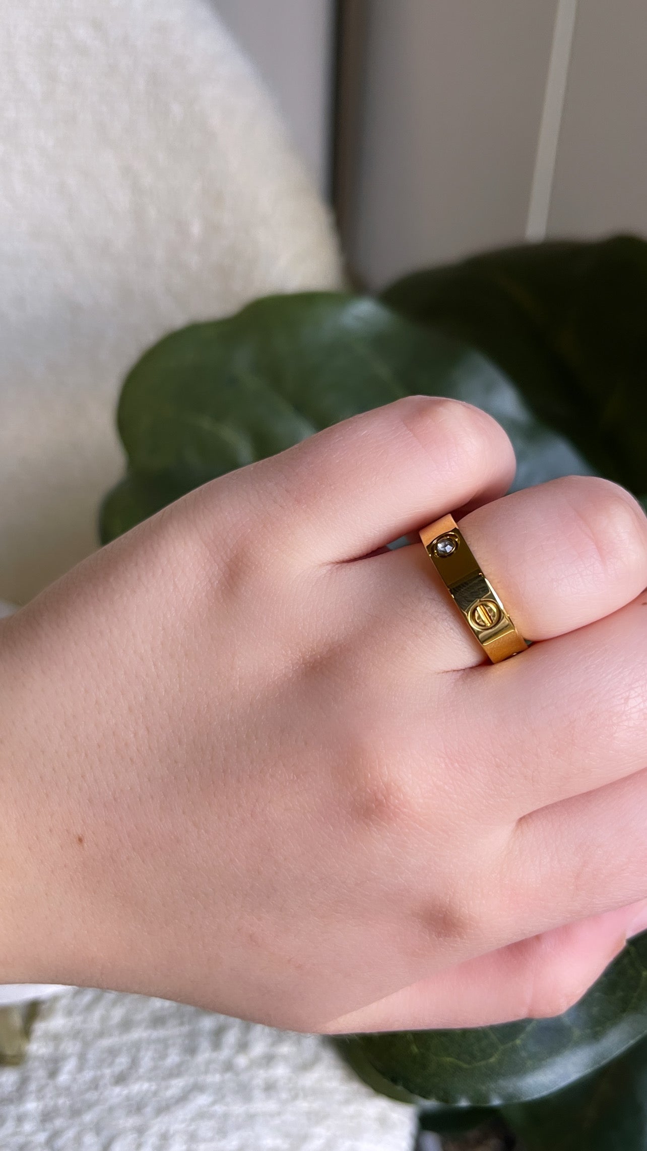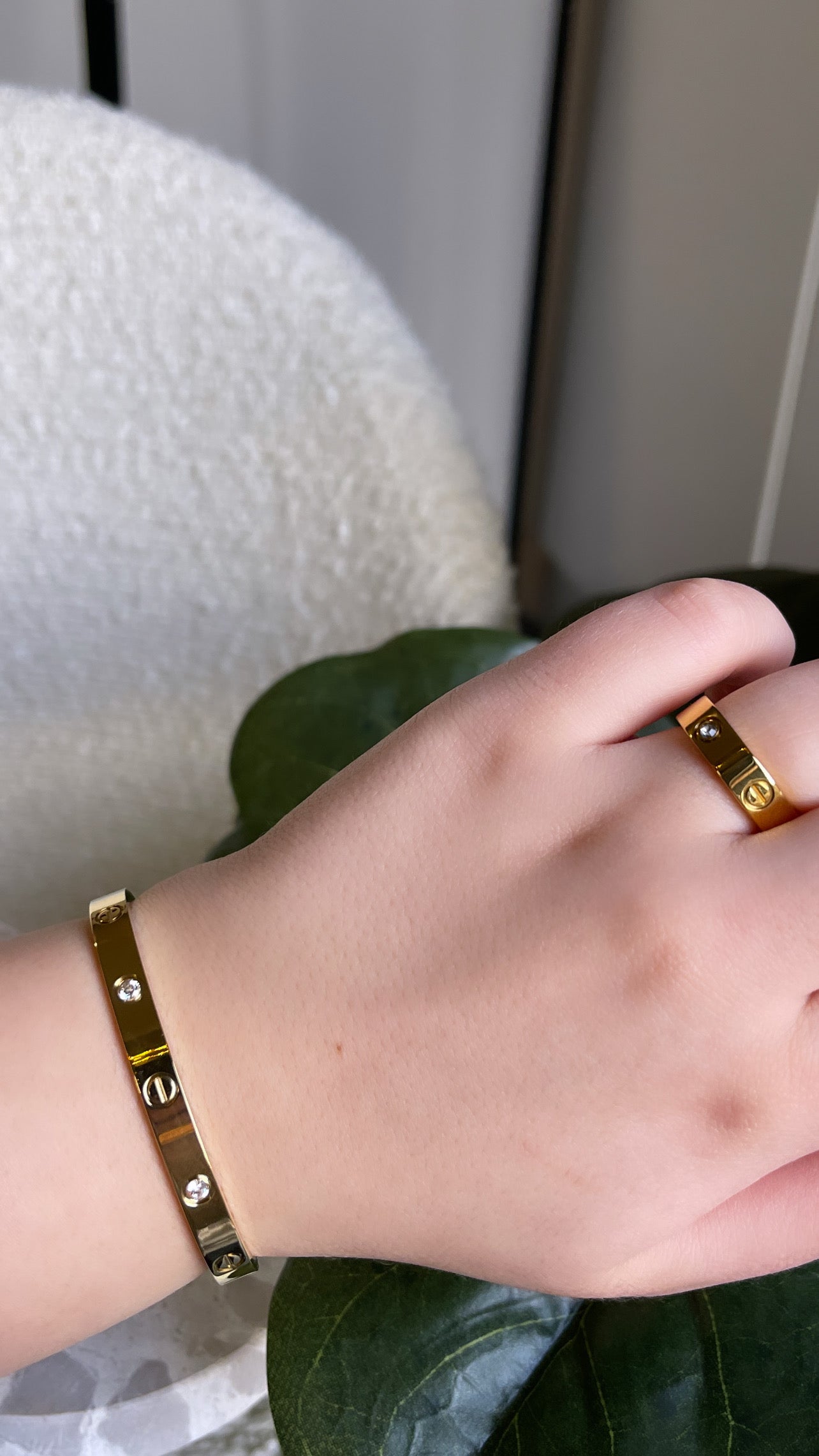 Simple yet elegant love ring with minor crystals around crafted by 18k gold plating, perfect for everyday wear. This ring also comes with a matching bracelet which is available in our set collection.
