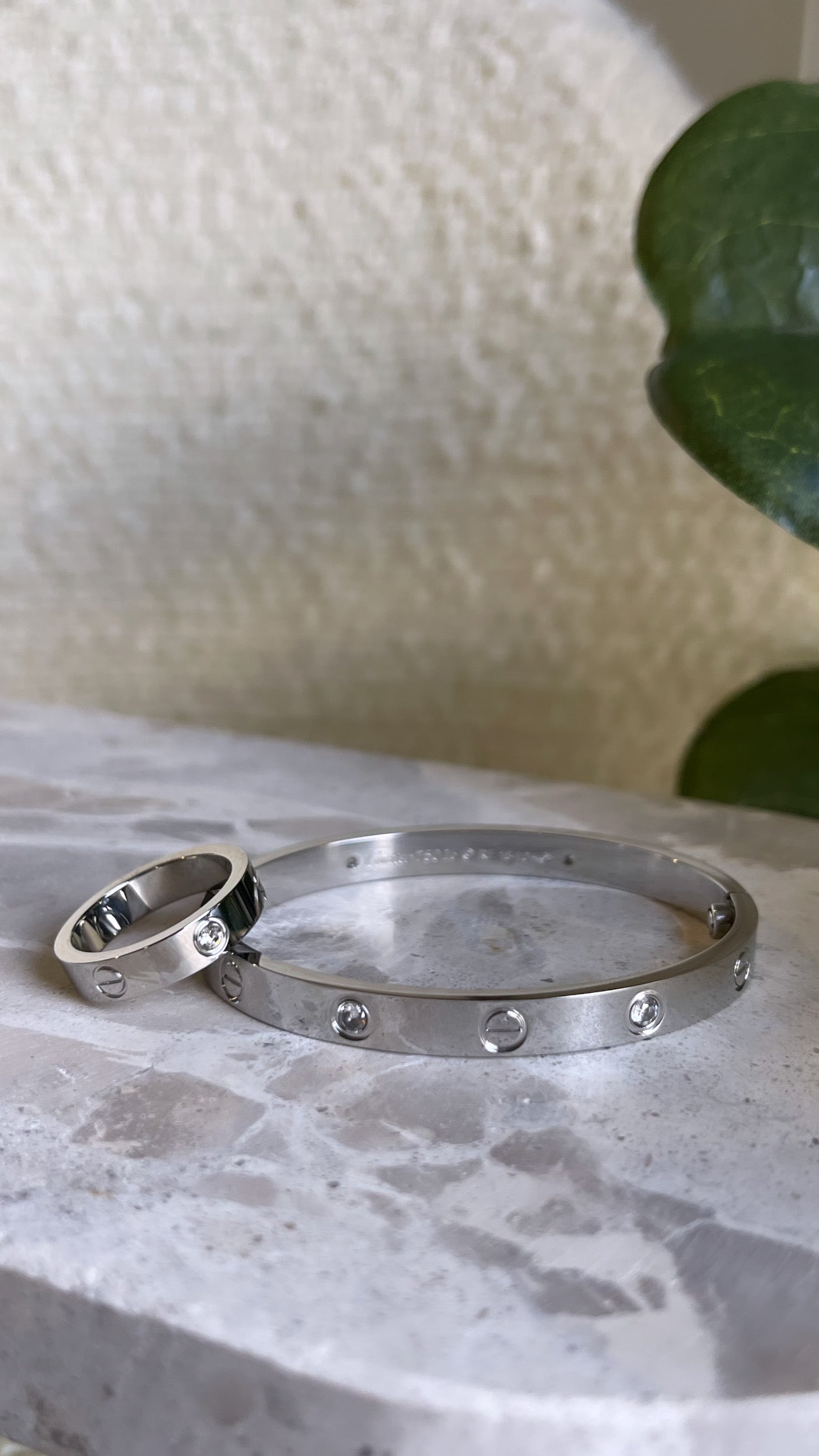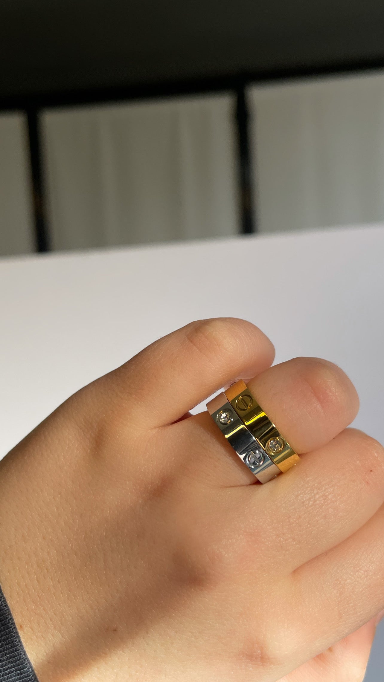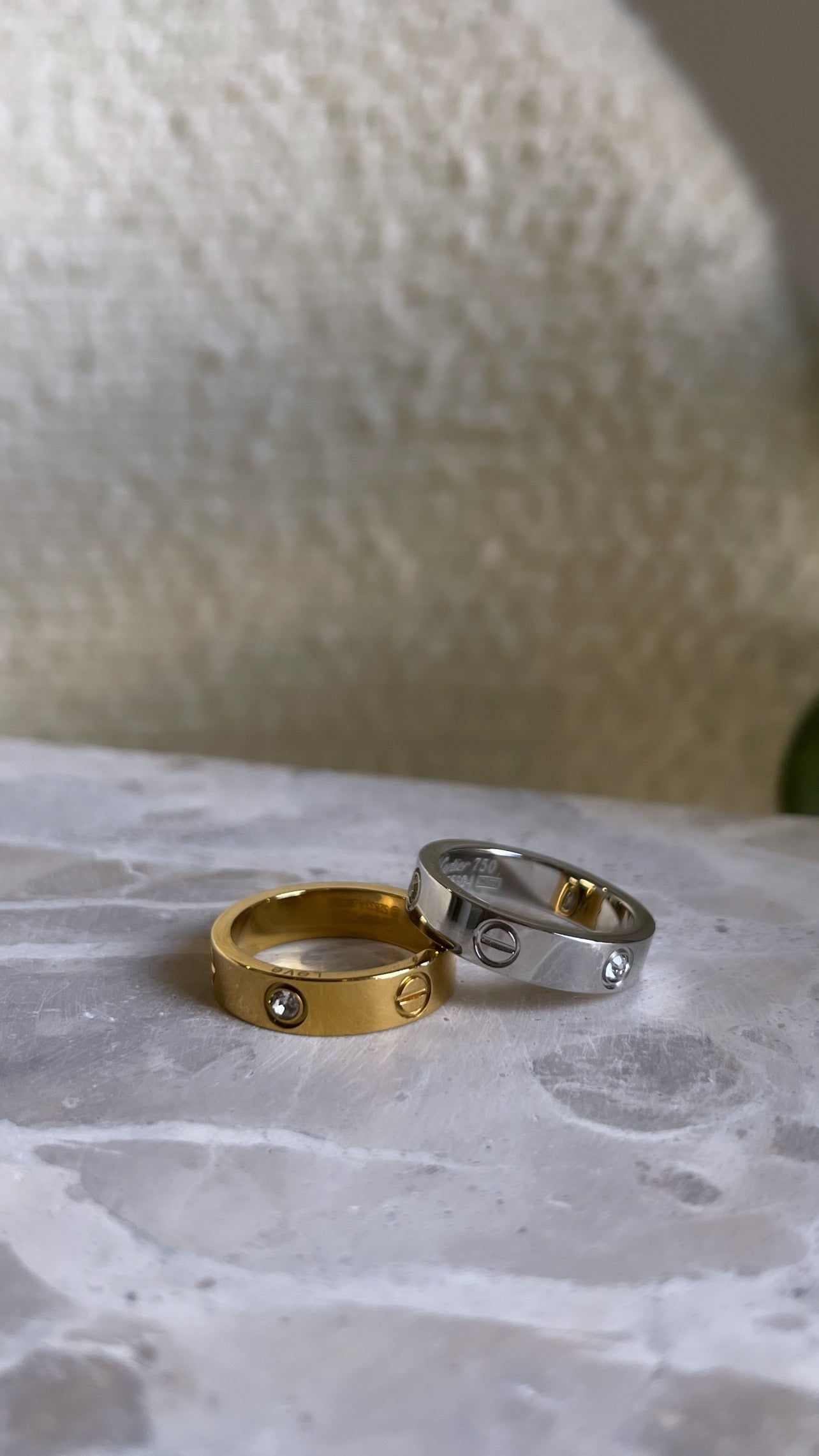 Simple yet elegant love ring with minor crystals around crafted by 18k gold plating, perfect for everyday wear. This ring also comes with a matching bracelet which is available in our set collection.