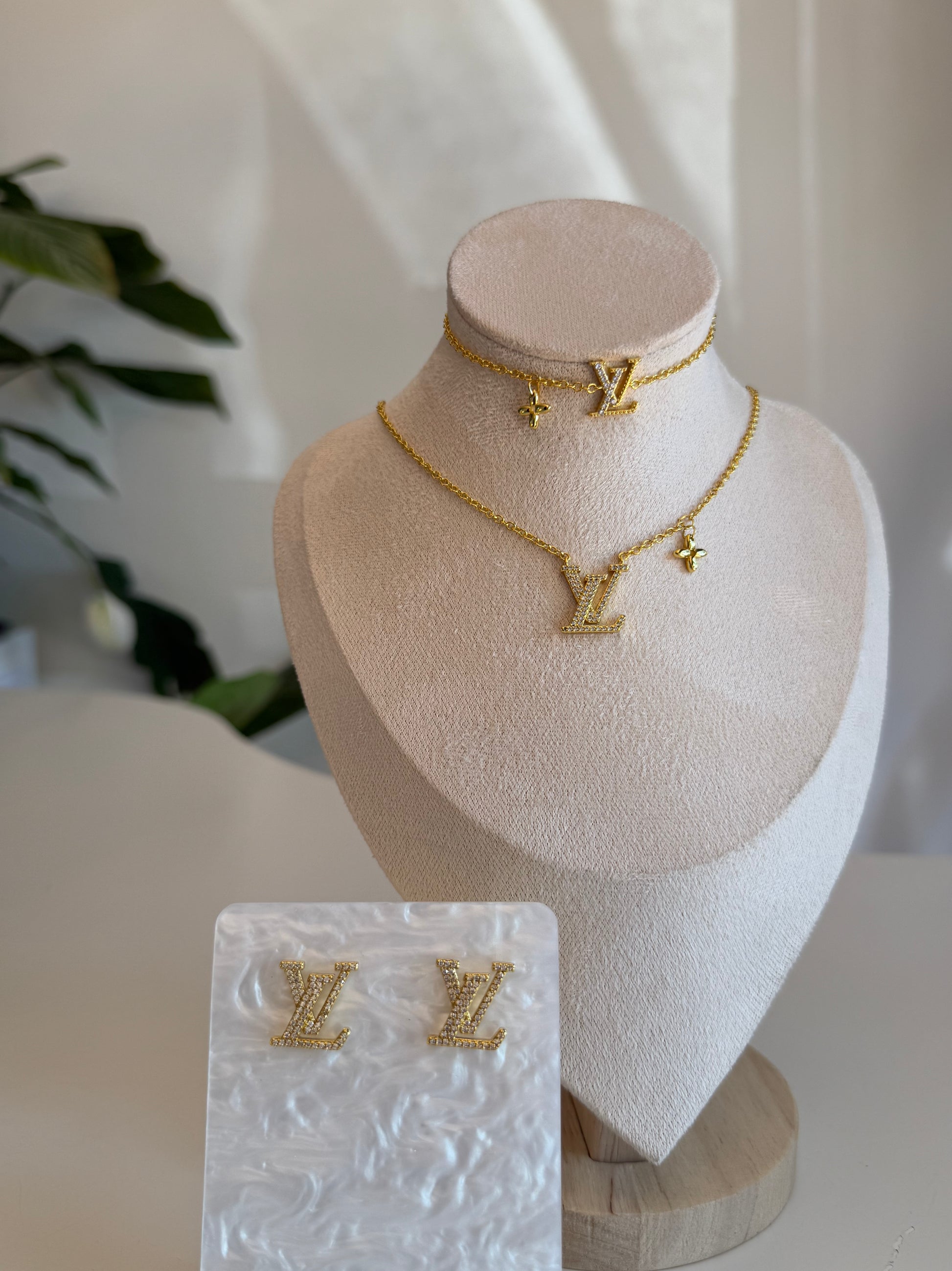 This elegant set features a necklace, bracelet, and earrings in gold, and a matching necklace and bracelet in silver. Each piece is available for individual purchase.