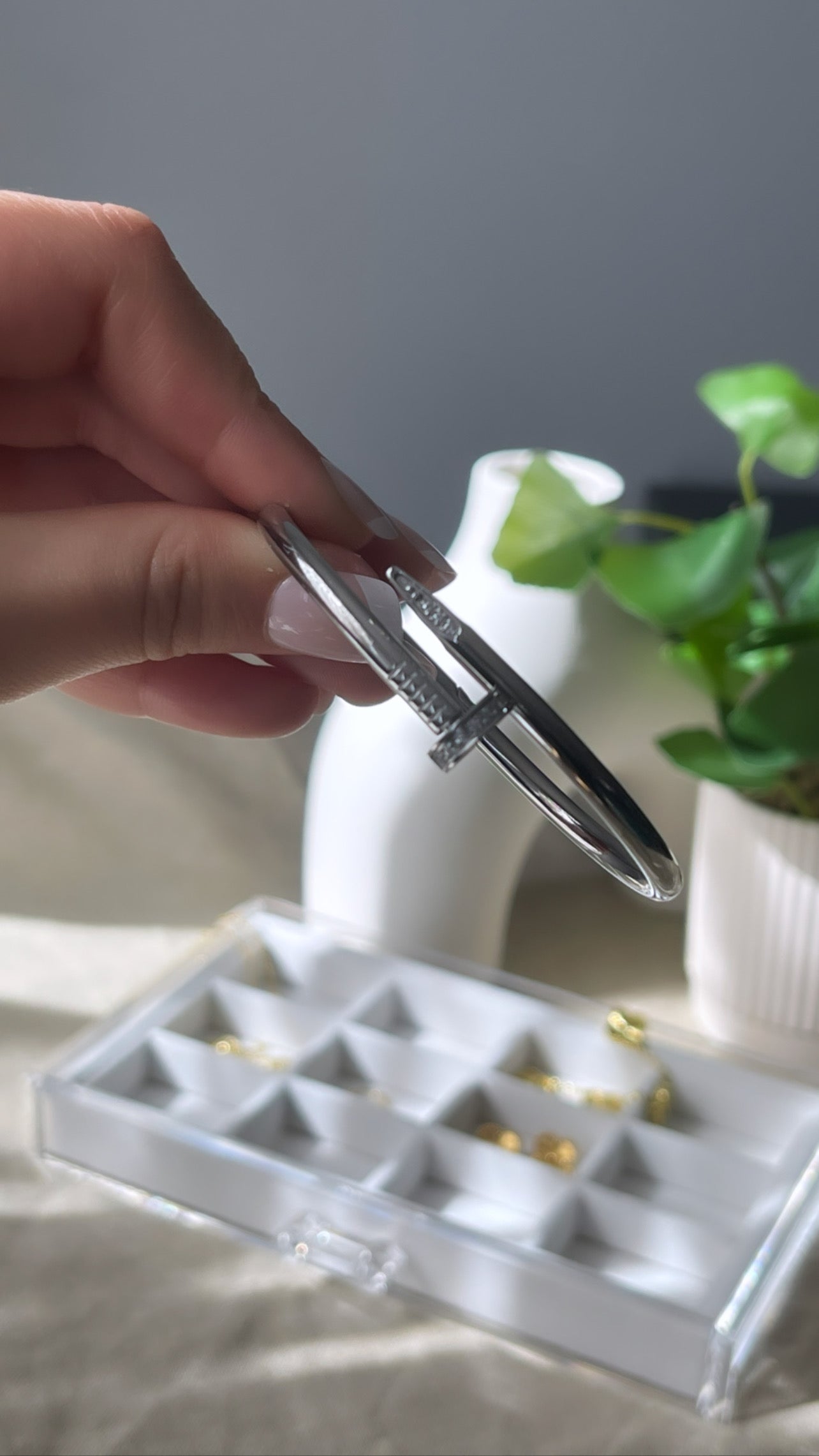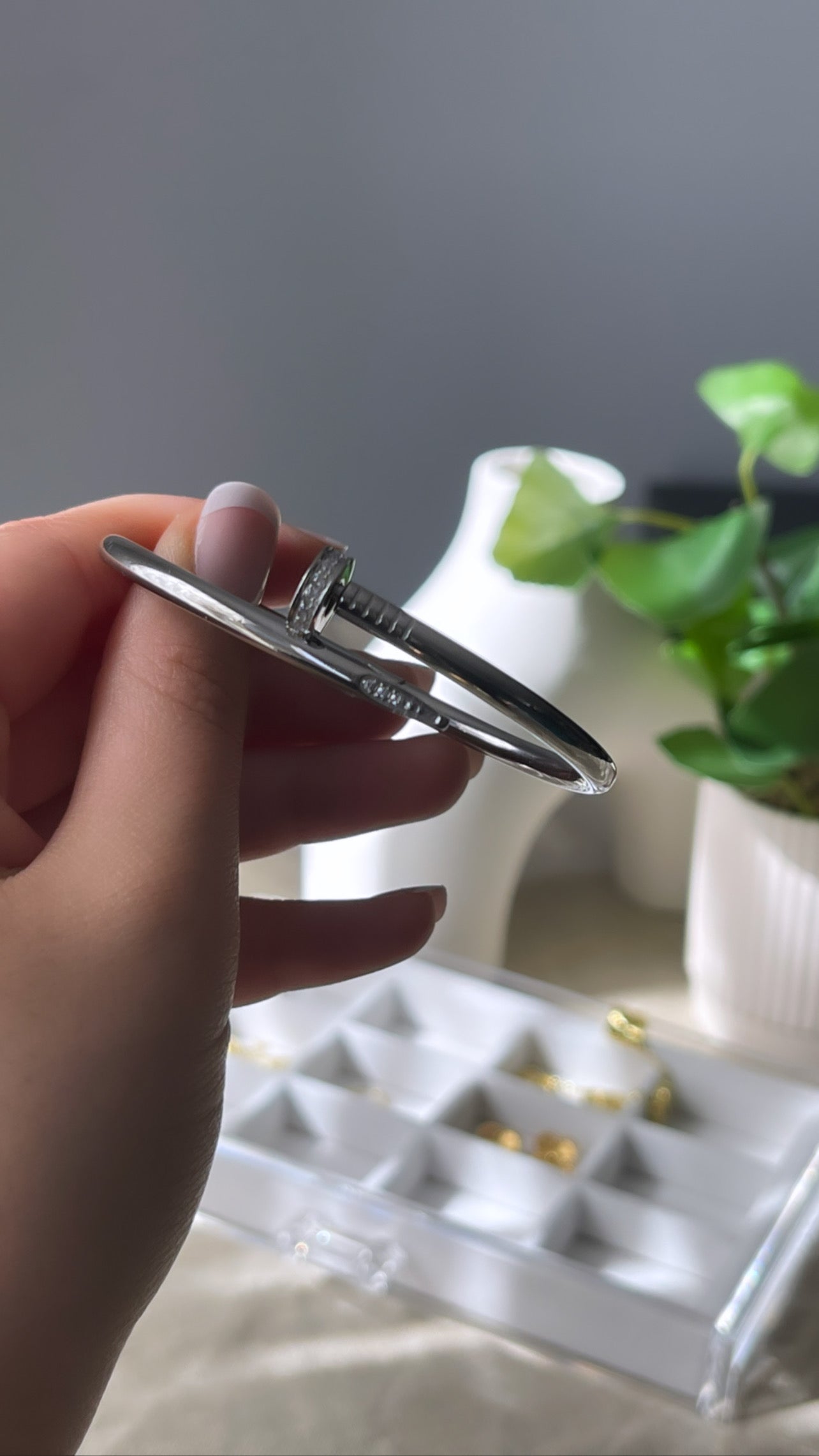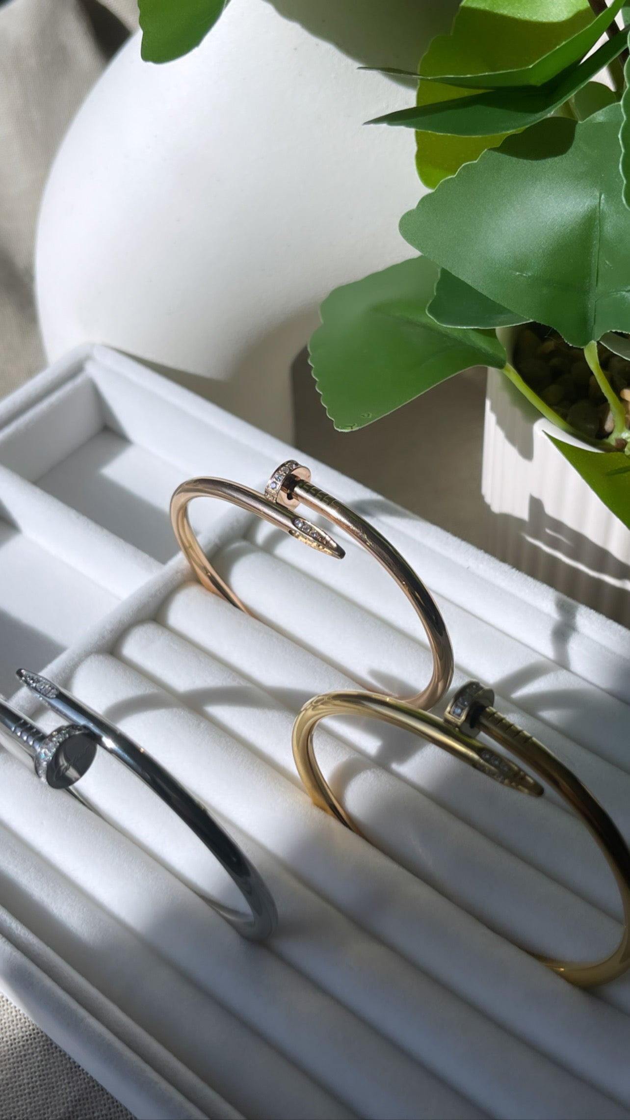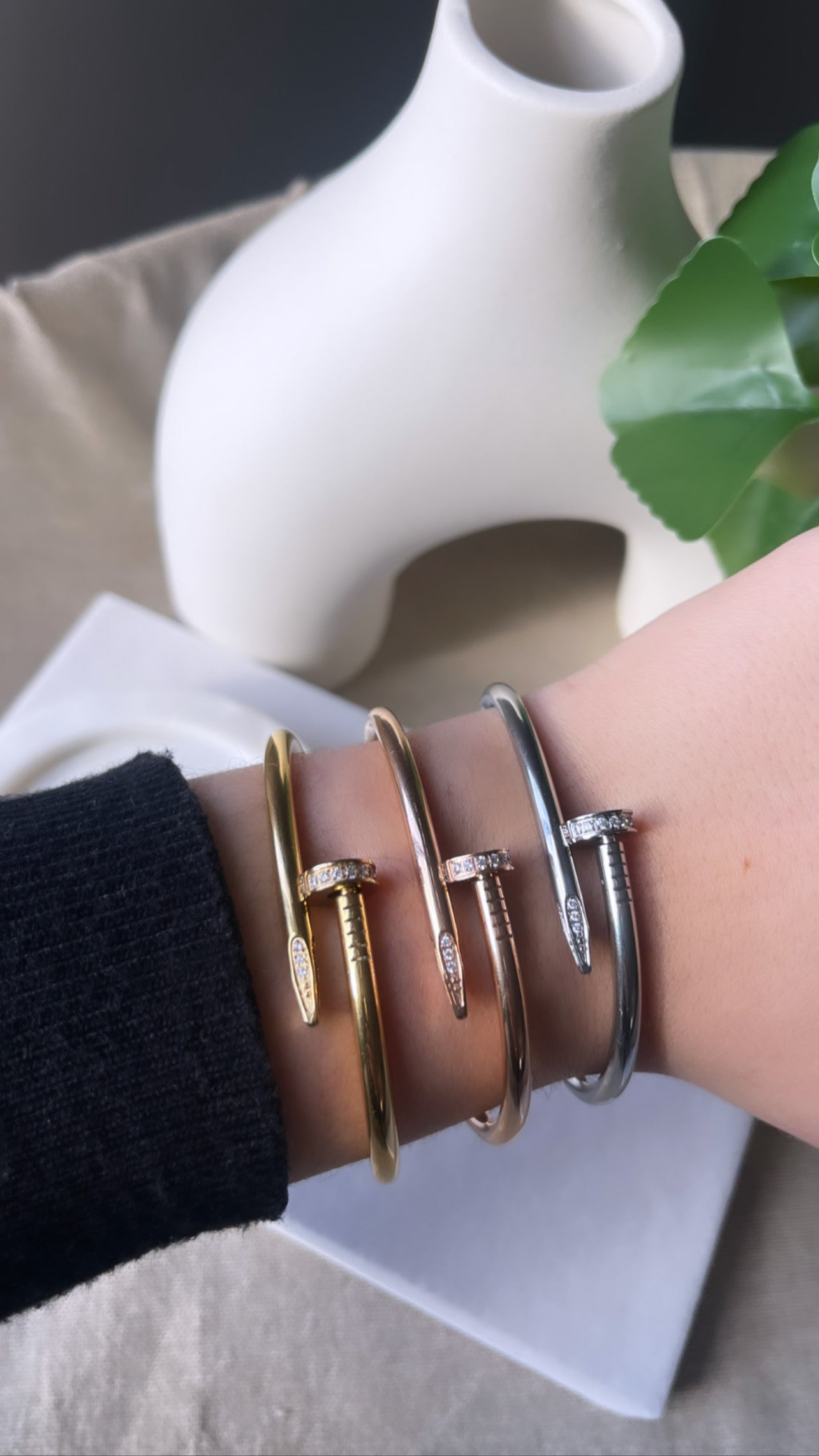 This stunning nail bracelet is available in a bracelet and ring both in silver and gold.