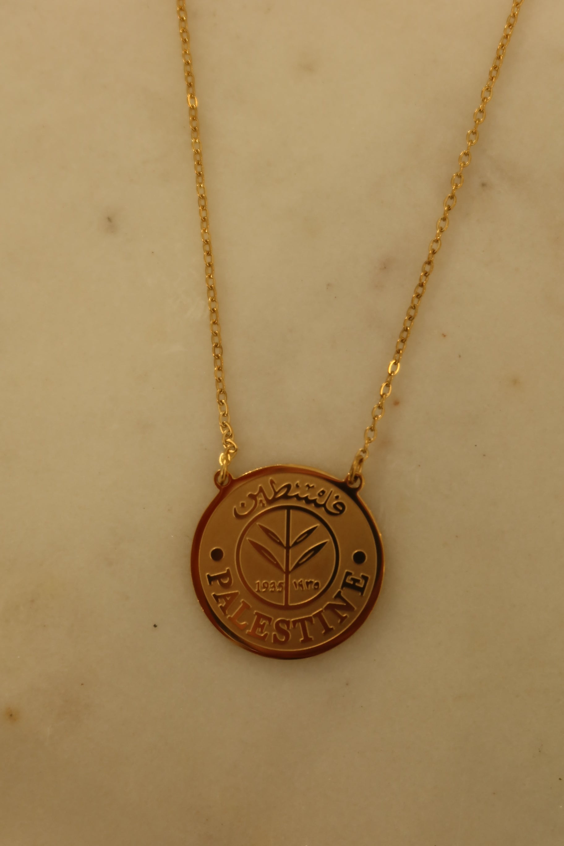A meaningful piece that carries history and pride. Inspired by the original 1927 Palestine coin, this necklace symbolises resilience, identity, and heritage. Crafted with a luxurious gold finish, it’s perfect for layering or wearing as a timeless statement piece.