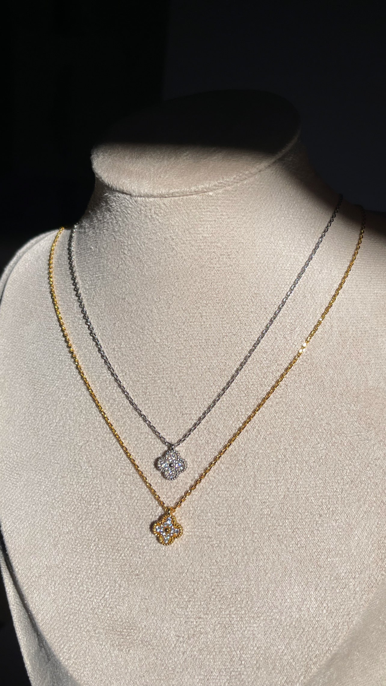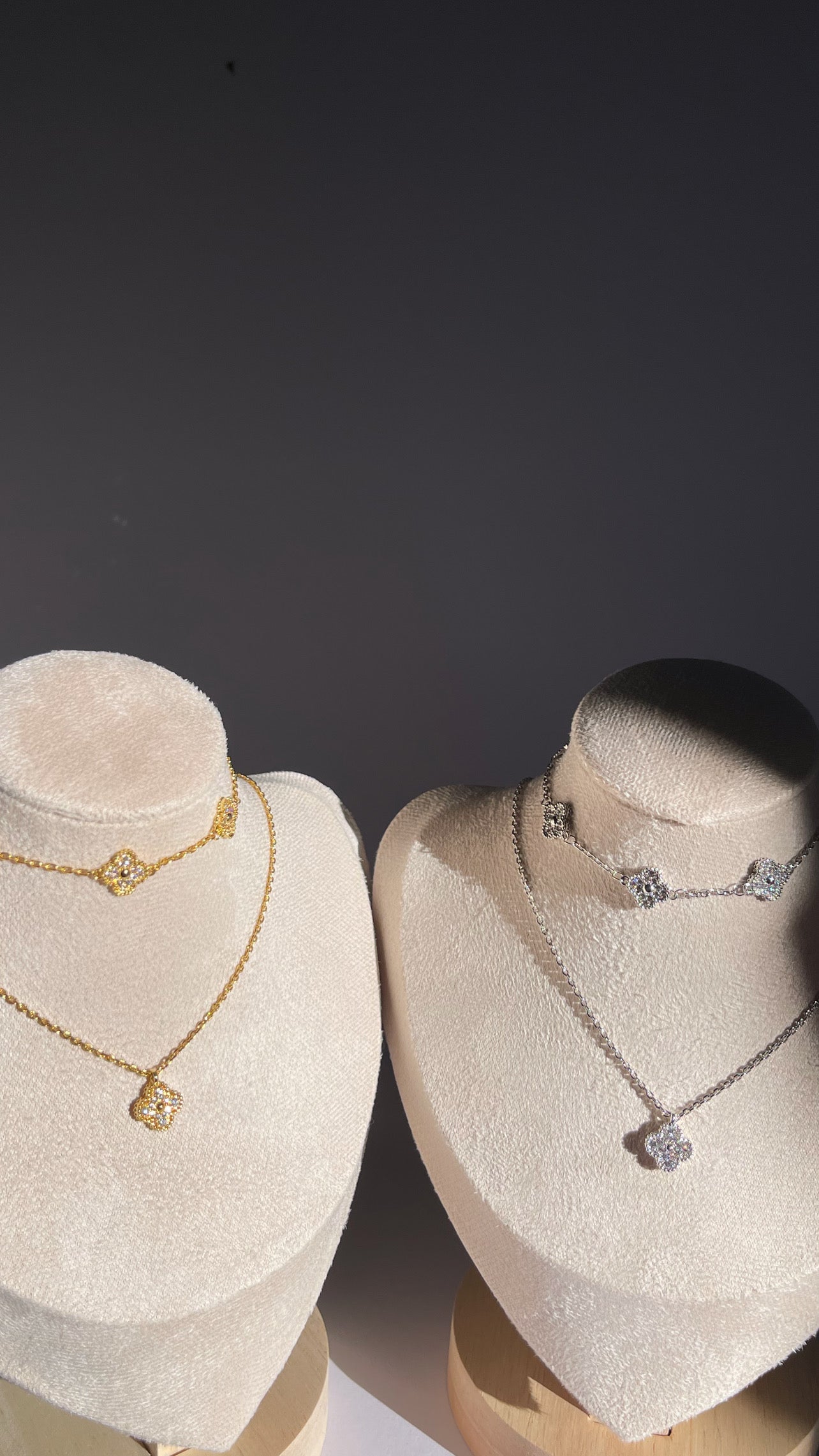 This elegant and dainty clover bracelet comes with multiple clovers that are small and have crystals around the clover. This set comes with a bracelet and necklace available in gold and silver.