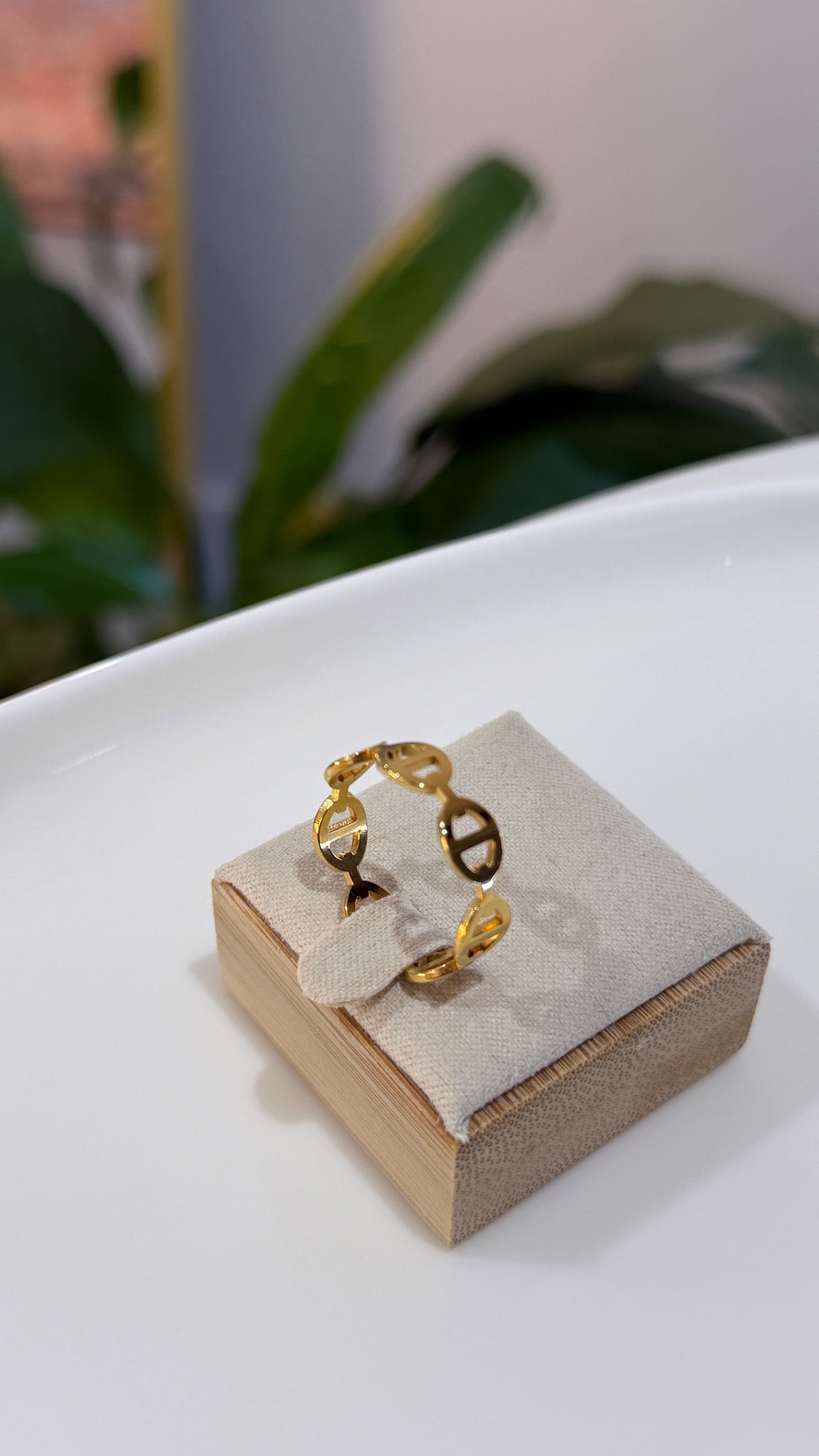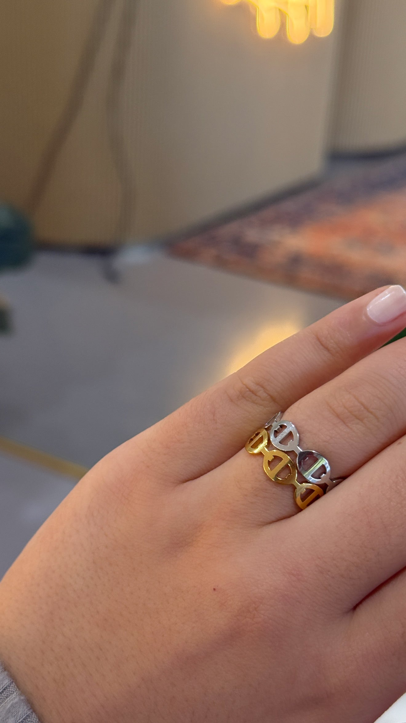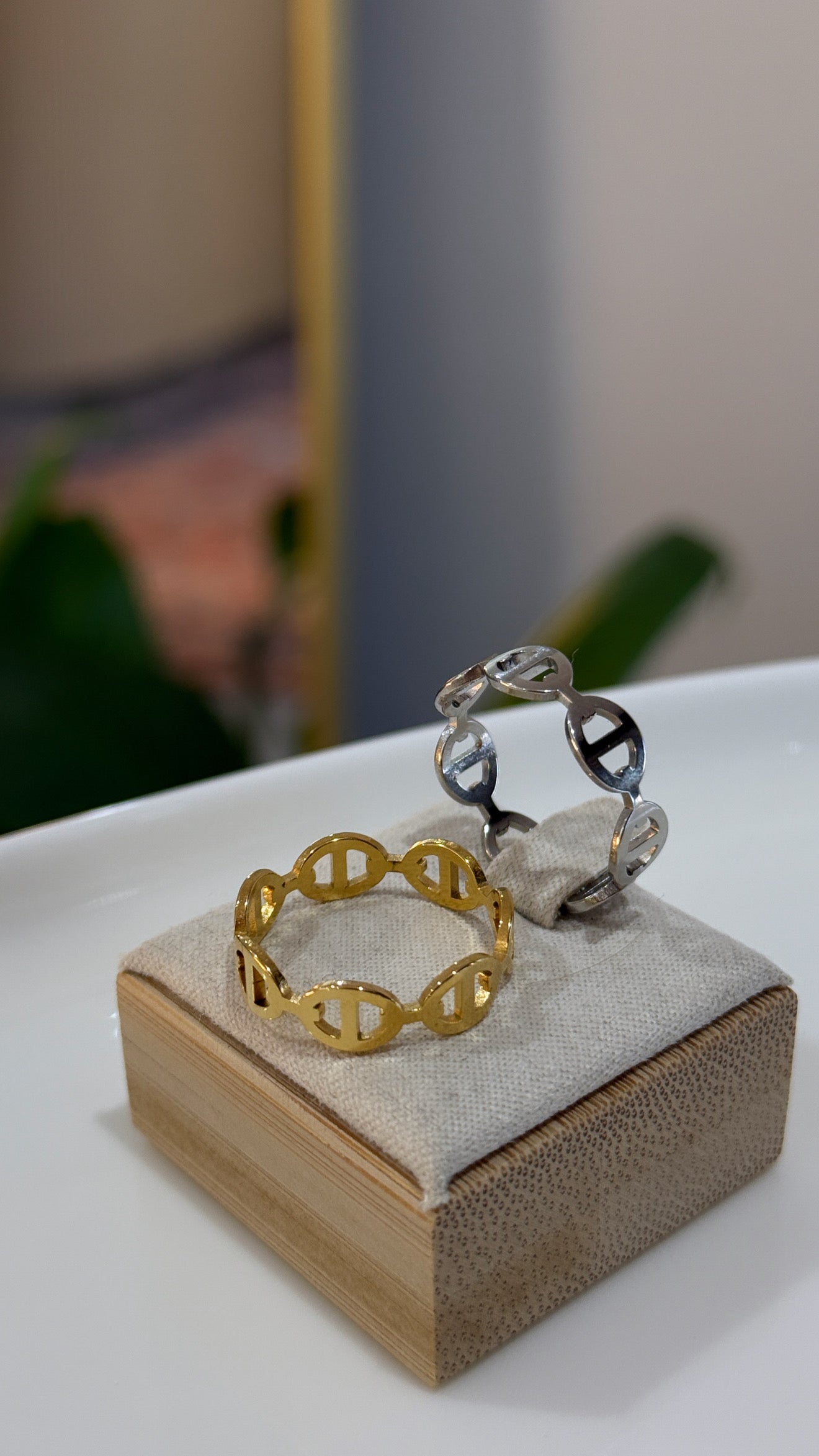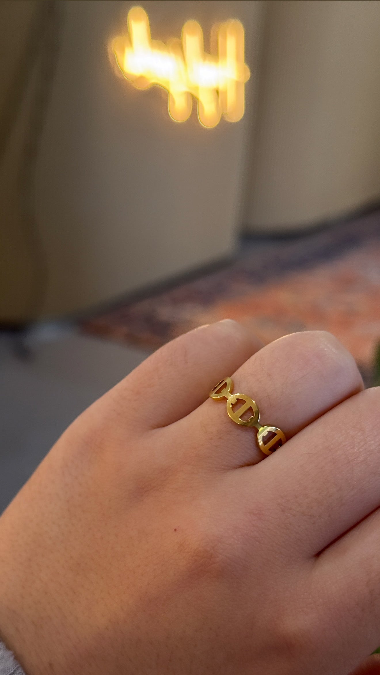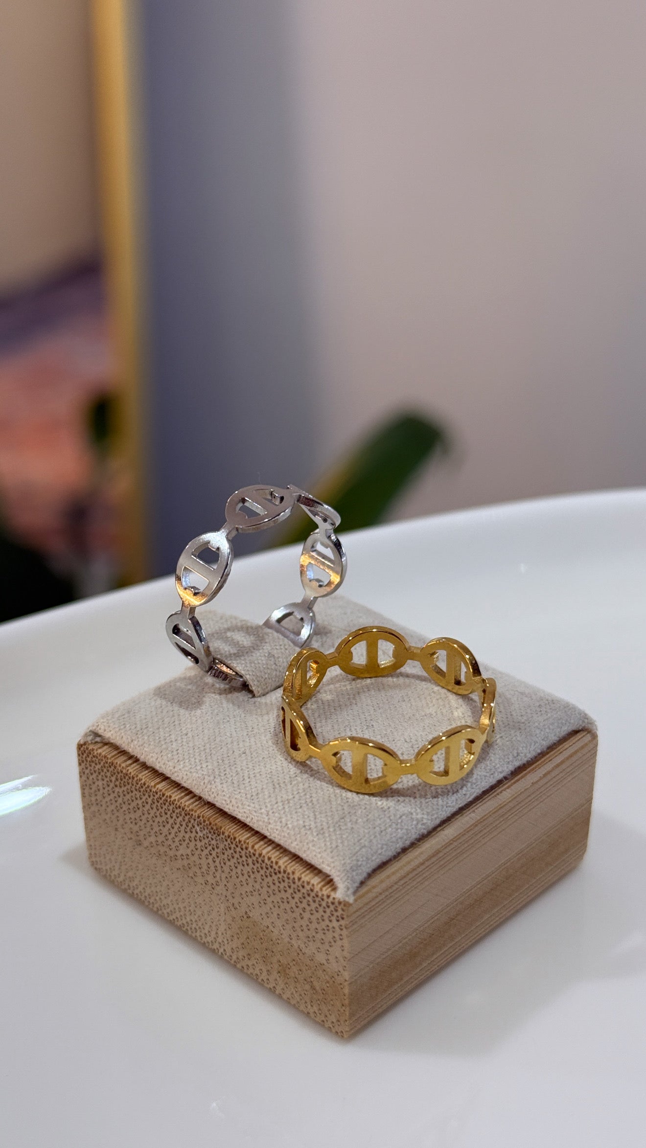 Bold, modern, and effortlessly cool — the Twist Link Ring features a distinctive open-link design, available in both gold and silver finishes. Crafted with 18k gold plating and a tarnish-free coating, this ring is made to shine day after day.